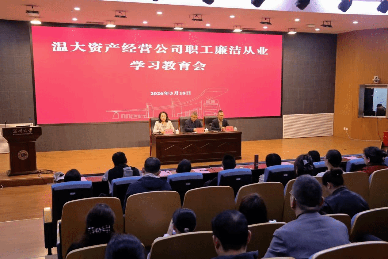 为持续筑牢干部职工廉洁从业思想防线,压紧压实廉洁从业责任,强化纪律规矩意识,3月18日下午,温州大学资产经营有限公司在岩松堂步青厅组织召开职工廉洁从业学习教育会,公司全体职工参会学习。
